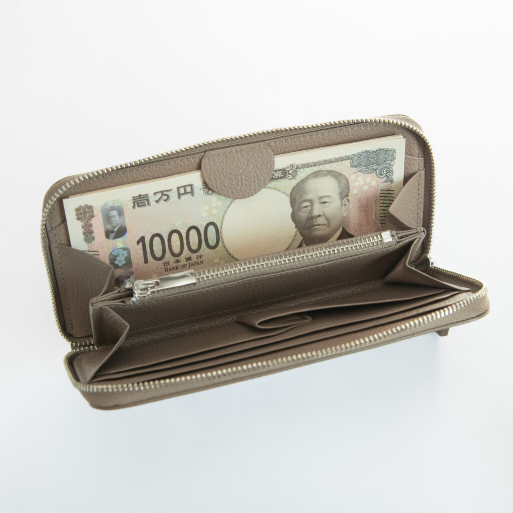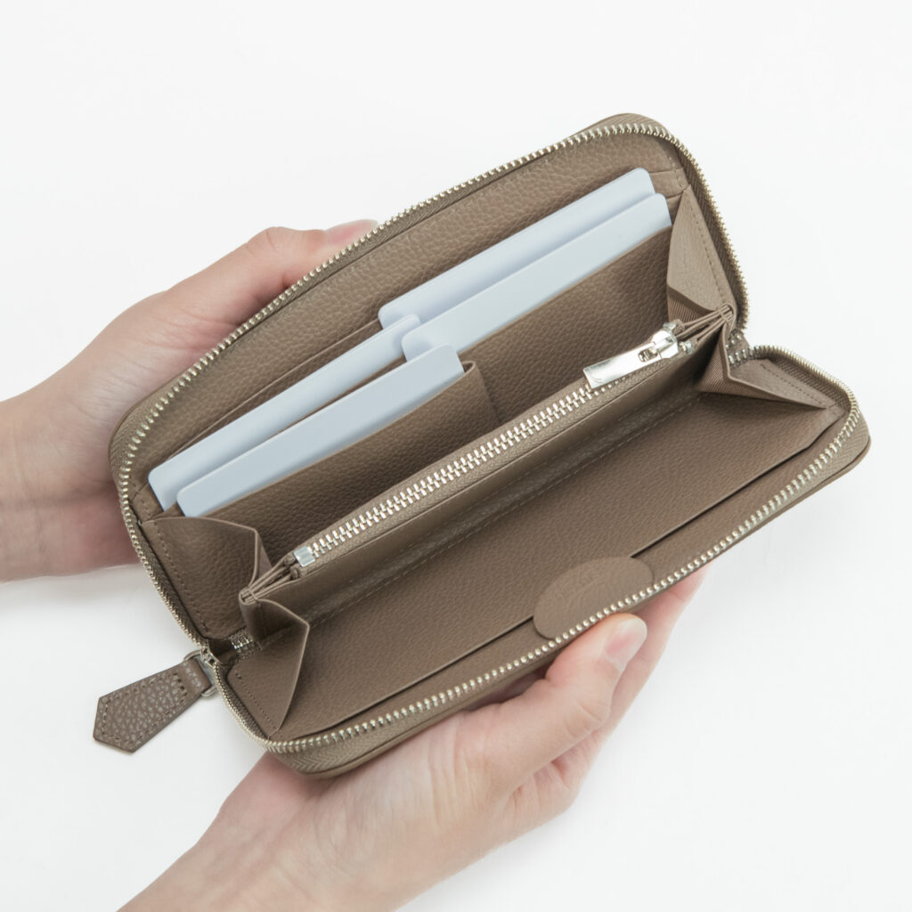 従来までのラウンドジップ長財布は小銭入れが深くて全体が見えづらく、取り出しにくいものが多かったため、改良を重ねました!小銭入れを浅くすることで無駄なスペースを削り、取り出しやすくなりました。
